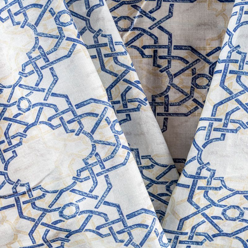 Плательно-блузочная ткань из натурального хлопка с крупным марокканским узором-решеткой в синих и бежевых цветах на молочном фоне. Ткань легкая, тонкая, хорошо "дышит", мягкая, слегка прозрачная, по плотности напоминает батист. Подойдет для пошива летнего платья, летящей юбки, блузы, сарафана или рубашки.