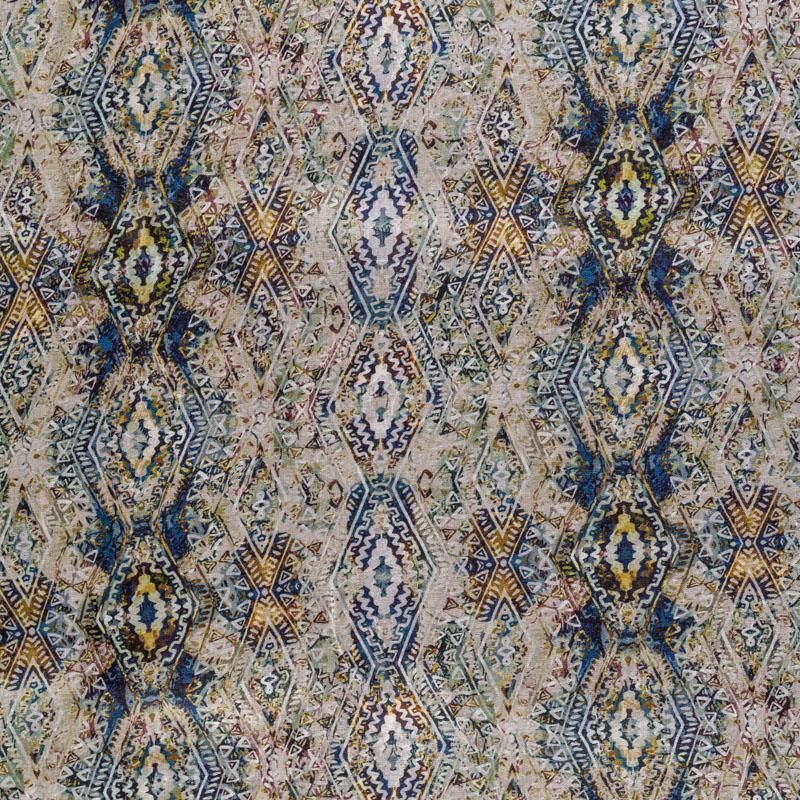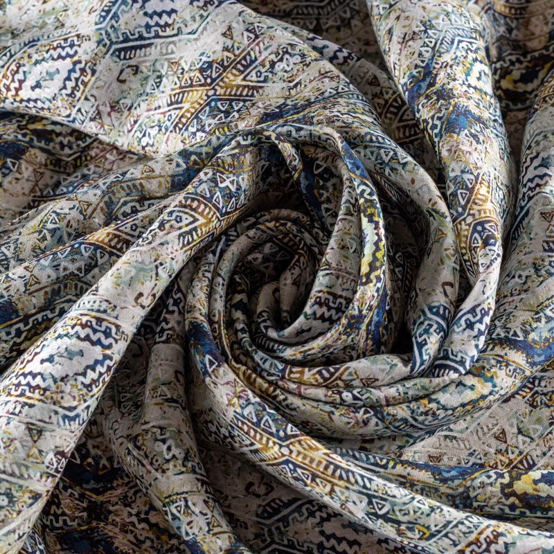 Плательно-блузочная ткань из натурального хлопка с добавлением льна с этническим узором в синих и зеленых тонах на светло-сером фоне. Ткань легкая, тонкая, хорошо "дышит", мягкая, слегка прозрачная, по плотности напоминает батист. Подойдет для пошива летнего платья, летящей юбки, блузы, сарафана, туники или рубашки.