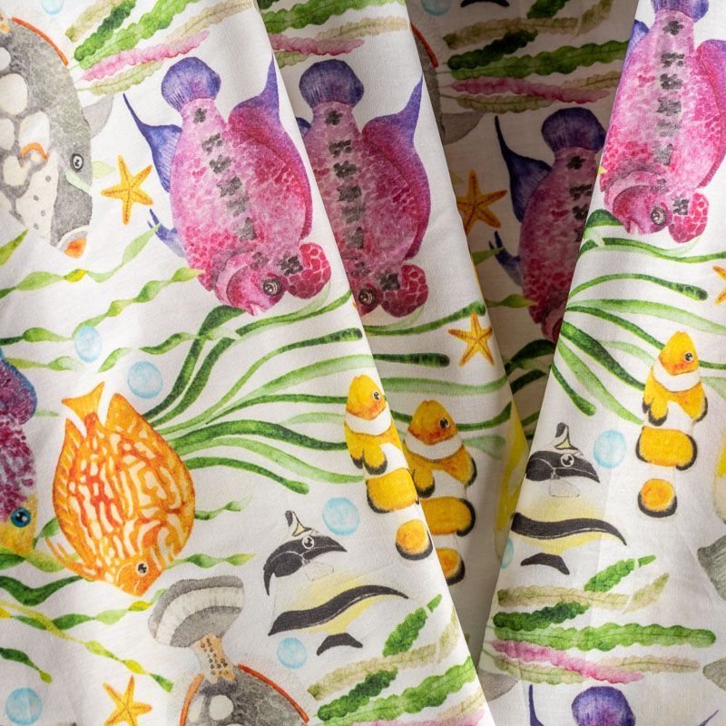 Итальянский натуральный хлопок с ярким принтом в виде морских обитателей. Ткань легкая, тонкая, хорошо "дышит", мягкая, слегка прозрачная, по плотности напоминает батист. Подойдет для пошива домашней одежды, детских летних платьев, песочников, юбки, сарафана или рубашки, а также для для пошива постельных принадлежностей, подушек, покрывал, скрапбукинга, корзин и других видов творчества.