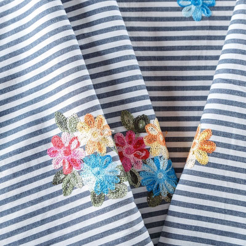 Плательно-блузочный хлопок белого цвета в серо-голубую полоску декорирован яркой цветочной вышивкой. Полотно средней плотности, слегка просвечивает, очень нежное и пластичное, держит форму. Материал отлично драпируется, формируя мягкие складки. Подойдет для прямых, полуприлегающих, расклешенных моделей платьев, сарафанов, а также юбки, туники, платье-рубашки.