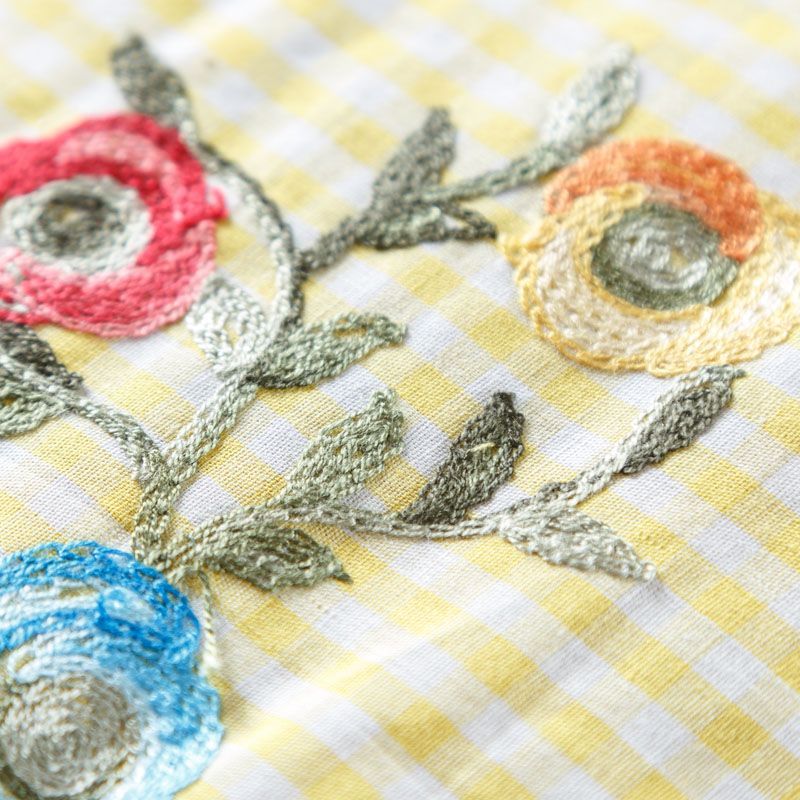 Плательно-блузочный хлопок в мелкую желто-белую клеточку декорирован яркой цветочной вышивкой. Полотно средней плотности, слегка просвечивает, очень нежное и пластичное, держит форму. Материал отлично драпируется, формируя мягкие складки. Подойдет для прямых, полуприлегающих, расклешенных моделей платьев, сарафанов, а также юбки, туники, платье-рубашки.