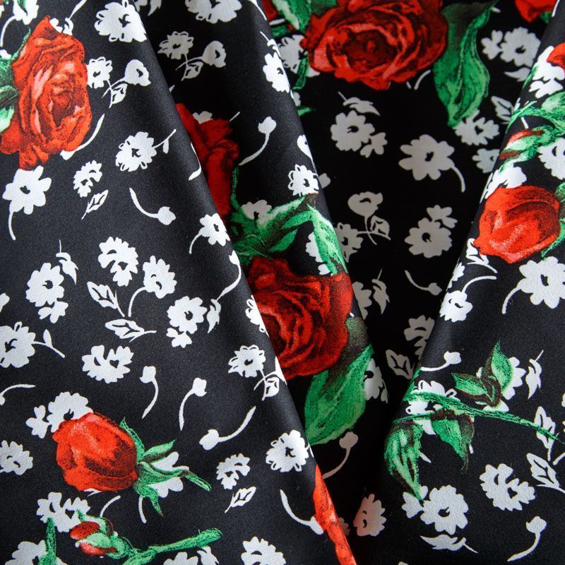 Коттон черного цвета с ярким цветочным принтом. Поверхность гладкая, матовая, ткань средней плотности, не толстая, хорошо держит форму, тянется за счет эластана в составе. Подойдет для пошива костюма, жакета, юбки, платья, брюк или шорт.