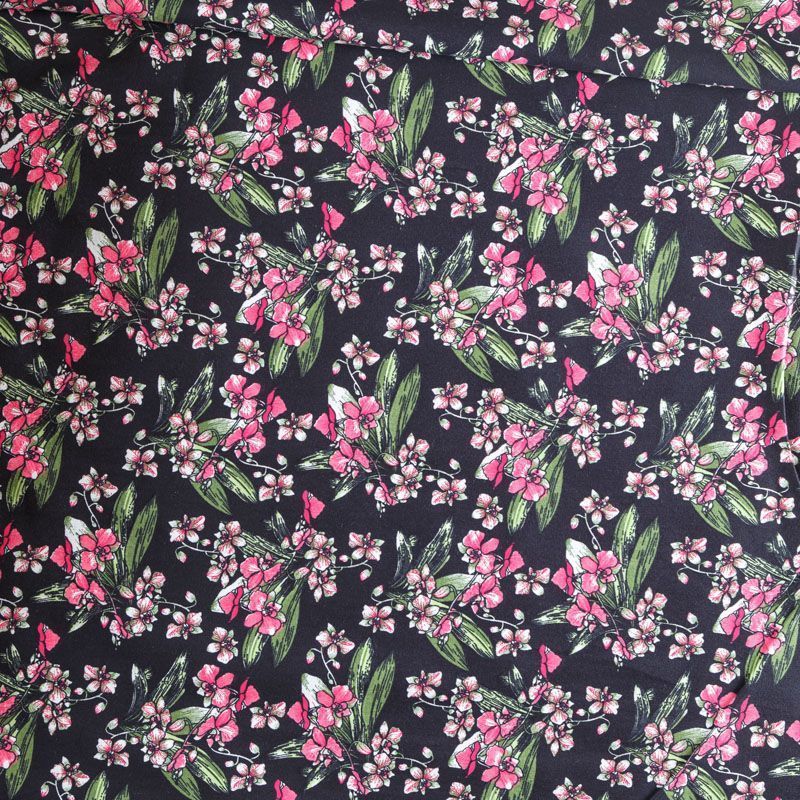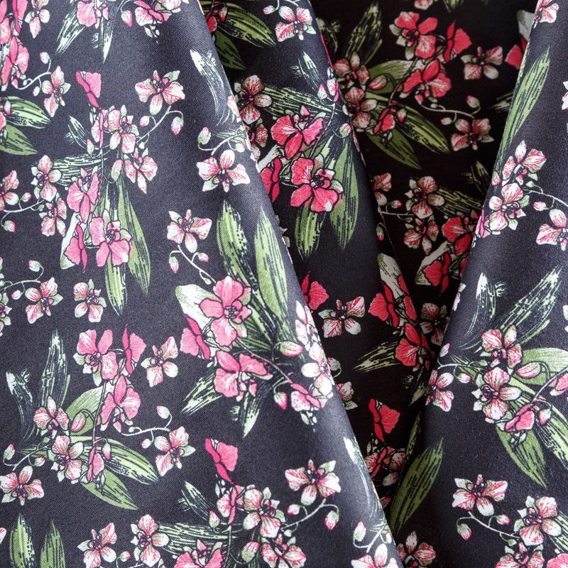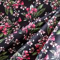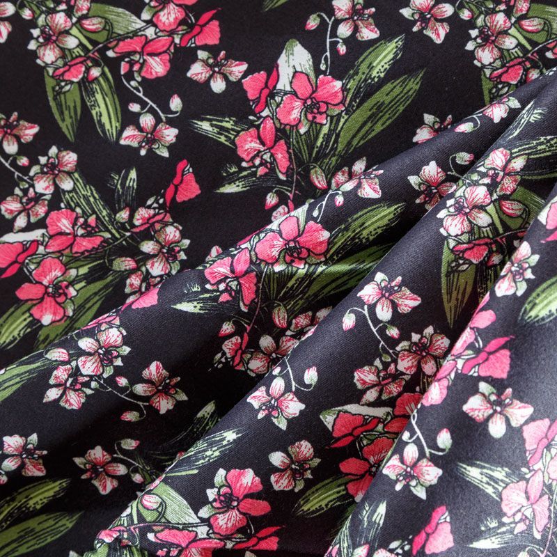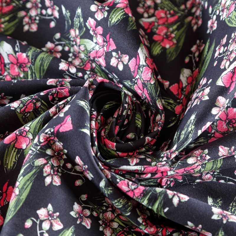 Коттон плательно-костюмной плотности черного цвета с цветочным принтом. Поверхность гладкая, матовая, хорошо держит форму, тянется за счет эластана в составе. Подойдет для пошива костюма, жакета, юбки, платья, брюк или шорт.