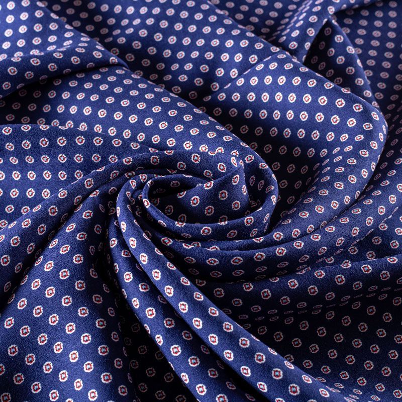 Натуральная вискозная ткань темно-синего оттенка с геометрическим мелким принтом. Легкая, хорошо тянется, драпируется струящимися складками, приятная и комфортная в носке. Материал слегка мнется имеет креповую фактуру. Идеально подходит для пошива платьев, юбок, блуз, комбинезонов.
