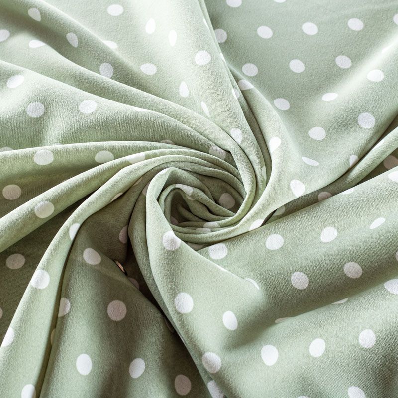 Плательный креп с принтом в горох. Ткань средней плотности, не толстая, пластичная, поверхность полотна матовая, с характерной мелкозернистой фактурой, прочная, хорошо драпирующаяся. Превосходно подойдет для пошива стильного костюма, юбки, платья, комбинезона, топа, брюк.