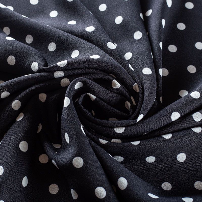 Плательный креп с принтом в горох. Ткань средней плотности, не толстая, пластичная, поверхность полотна матовая, с характерной мелкозернистой фактурой, прочная, хорошо драпирующаяся. Превосходно подойдет для пошива стильного костюма, юбки, платья, комбинезона, топа, брюк.