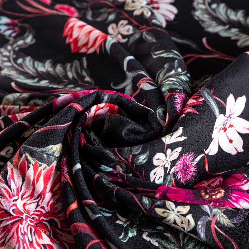 Итальянский смесовый креп плательной плотности глубокого черного цвета с красивым цветочным принтом. Поверхность матовая и фактурная, ткань малосминаемая, тянется за счет эластана в составе, красиво драпируется, струится и дает объемную складку, не просвечивает.Идеально подойдет для шикарного платья, блузы, юбки, комбинезона, брюк свободного кроя.