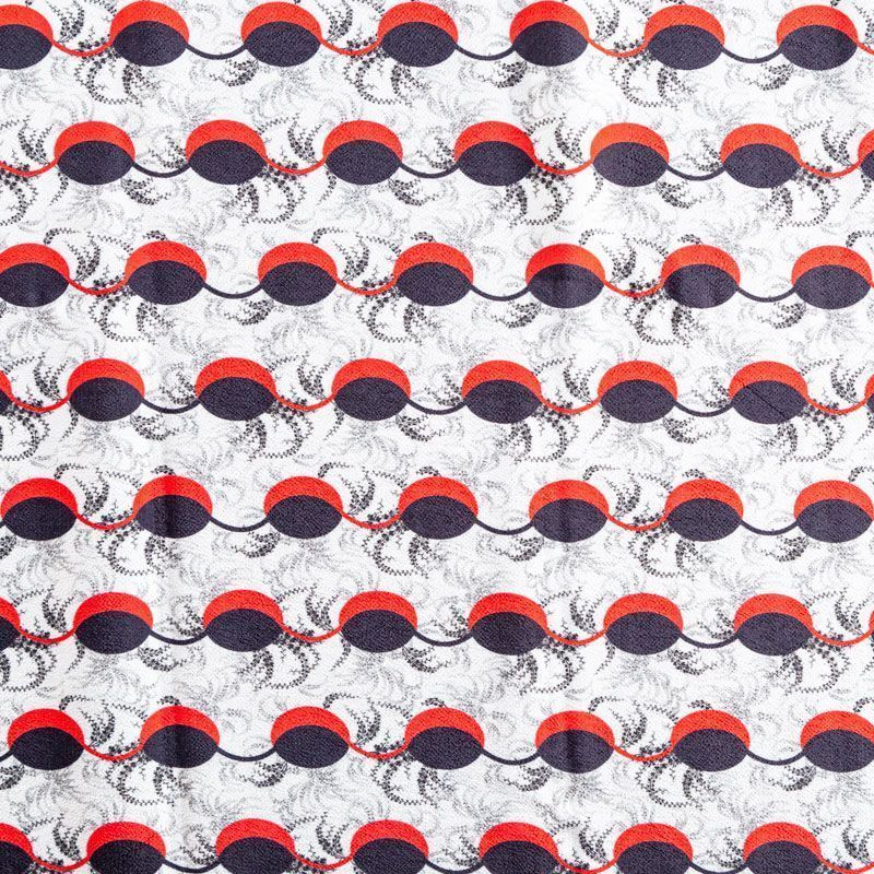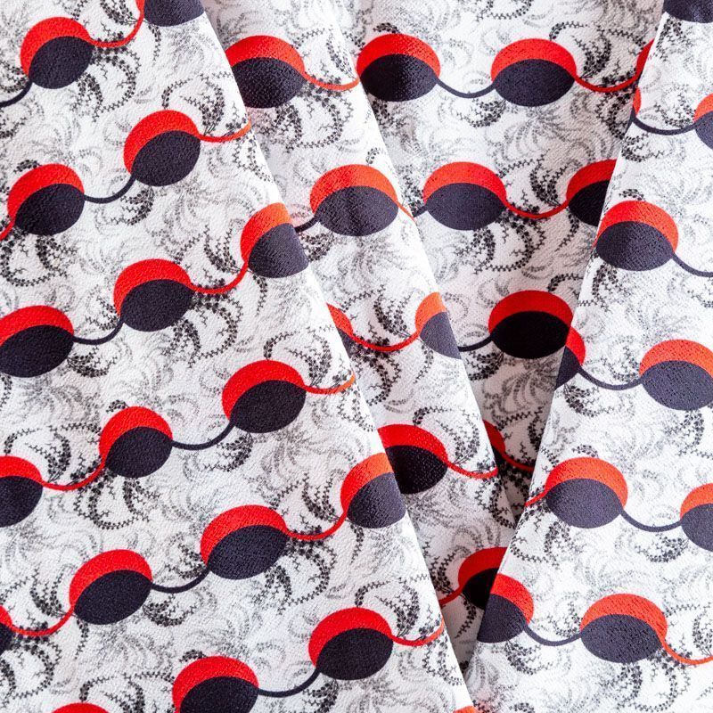 Итальянский вискозный креп плательной плотности светло-серого цвета с абстрактно-геометрическим принтом в черно-красных оттенках. Поверхность матовая и фактурная, ткань малосминаемая, красиво драпируется, струится и дает объемную складку, не просвечивает.Идеально подойдет для шикарного платья, блузы, юбки, комбинезона, брюк свободного кроя.