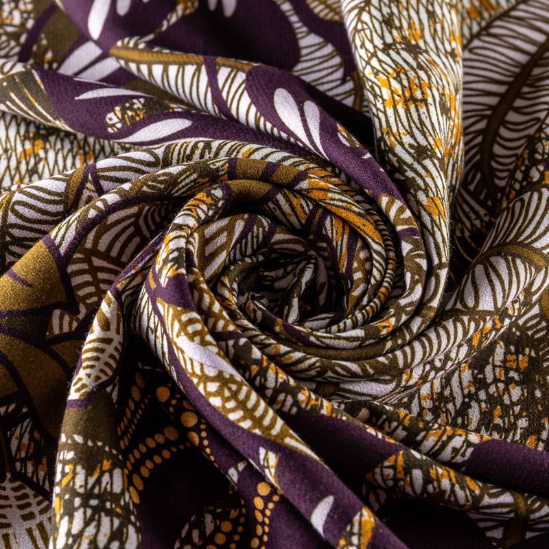 Натуральная вискозная ткань с абстрактным принтом в желто-болотных оттенках. Легкая, хорошо тянется, драпируется струящимися складками, приятная и комфортная в носке. Идеально подходит для пошива  платьев, юбок, блуз, комбинезонов. Материал слегка мнется и прозрачен на свету, имеет креповую фактуру.