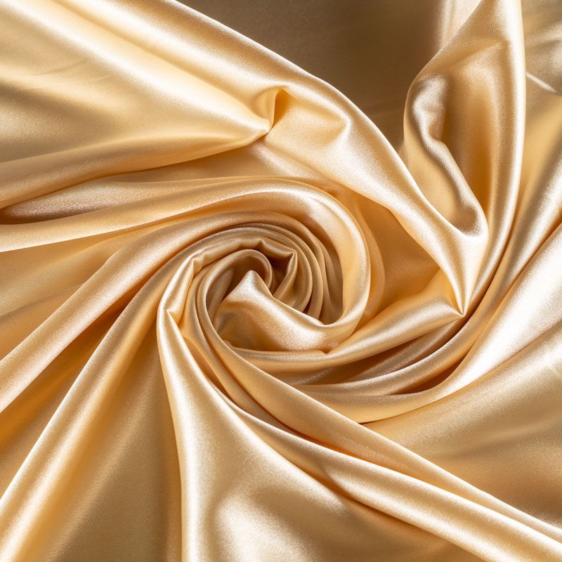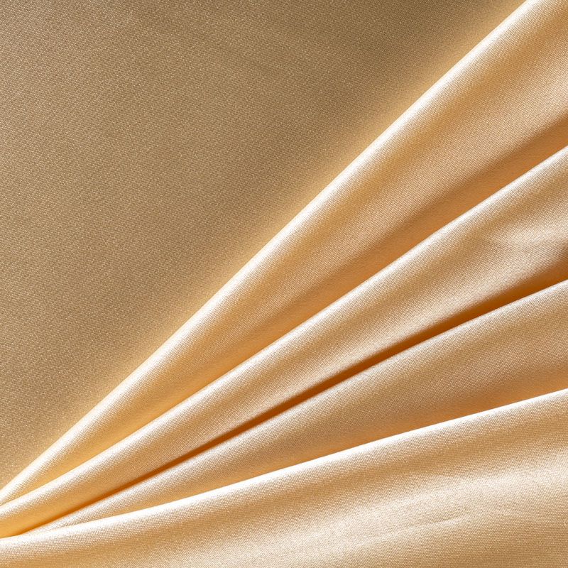 Ткань имеет атласную структуру с благородным блеском на лицевой стороне и слегка заметную мелкозернистую матовую поверхность на оборотной стороне. Ткань средней плотности, шелковистая, очень благородно блестит, играет, струится. Драпируется в красивые фалды, тянется за счет эластана в составе, не просвечивает.