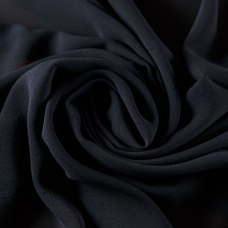 Итальянский креп-шифон черного оттенка, легкий, воздушный, мягкий и нежный, прекрасно драпируется, тянется, приятен к телу, прозрачный, требуется подклад. Текстура матовая с умеренным блеском. Идеален для нежных платьев летящих силуэтов, топов, туник, блузок, юбок с роскошными драпировками и воланами.