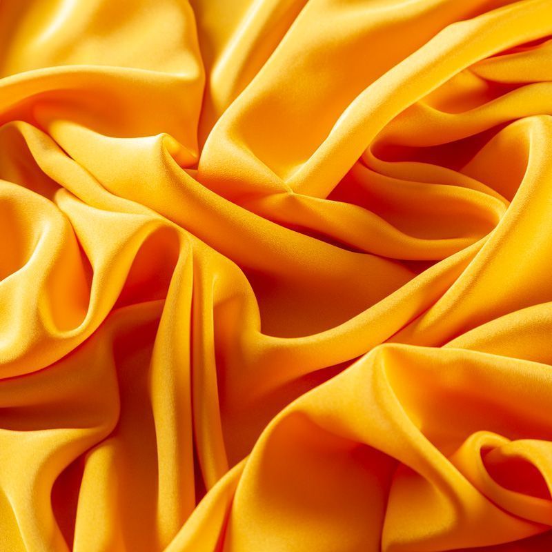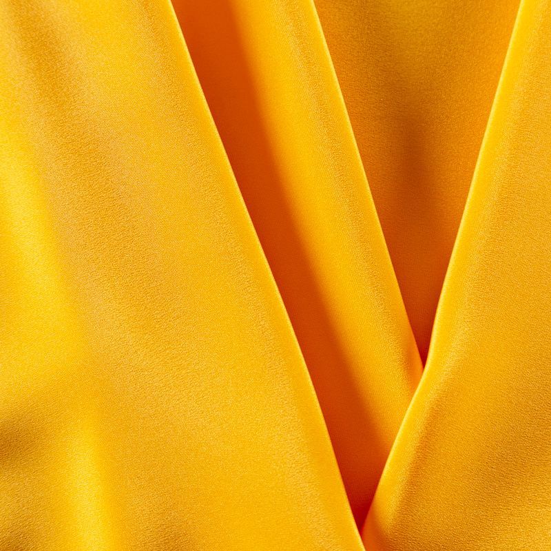 Итальянский натуральный шелковый крепдешин в насыщенном желтом оттенке, фактурный, легкий и струящийся, слегка просвечивает, отлично драпируется, тянется за счет эластана в составе. Идеально подойдет для пошива платьев и сарафанов расклешенных моделей, с воланами, летящих юбок, топов, блузки, юбки, широких брюк, костюма в пижамном стиле.