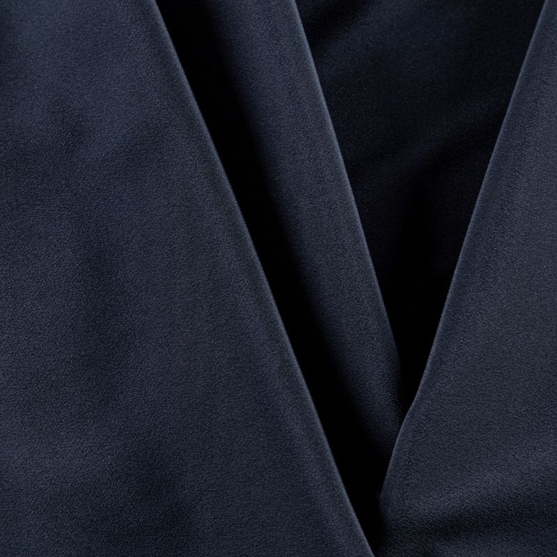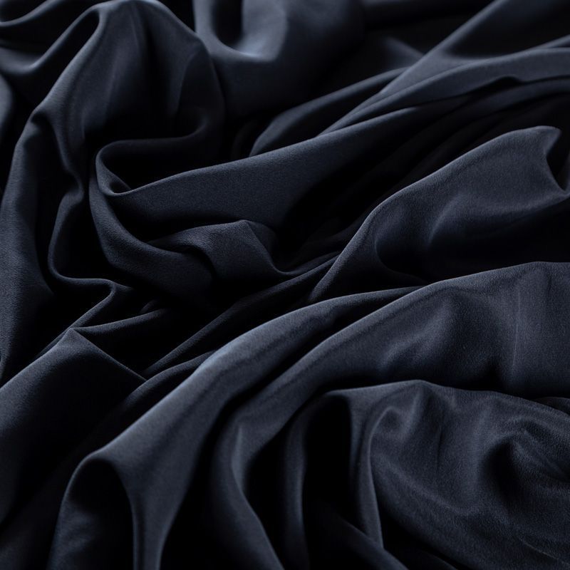 Итальянский натуральный шелковый крепдешин в черном оттенке, фактурный, легкий и струящийся, слегка просвечивает, отлично драпируется, тянется за счет эластана в составе. Идеально подойдет для пошива платьев и сарафанов расклешенных моделей, с воланами, летящих юбок, топов, блузки, юбки, широких брюк, костюма в пижамном стиле.
