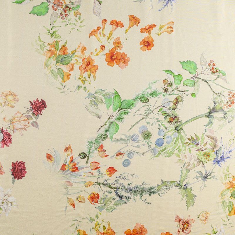 Итальянский натуральный крепдешин с акварельным цветочным  принтом на фоне дынного оттенка, тонкий, слегка прозрачный, отлично драпируется, легкий и струящийся с креповой поверхностью. Идеально подойдет для пошива платьев и сарафанов расклешенных моделей, с воланами, летящих юбок, топов, блузки, костюма в пижамном стиле.