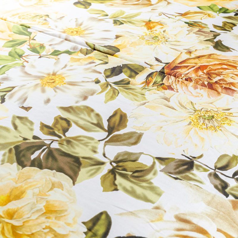 Натуральный шелковый крепдешин с матовой поверхностью, легкий, струящийся, хорошо драпируется. Цветочный принт выполнен бежево-оливковой гамме на белом фоне. Крепдешин прекрасно подойдет для пошива летнего сарафана, платья, блузки, костюма в пижамном стиле, широких брюк или юбки.