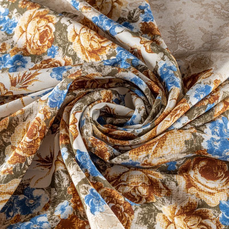Натуральный шелковый крепдешин с матовой поверхностью, легкий, струящийся, хорошо драпируется. Изысканное сочетание цветочного принта в коричнево-синих оттенках с имитацией нежного тонкого кружева подойдет для пошива летнего сарафана, платья, блузки, костюма в пижамном стиле, широких брюк или юбки.