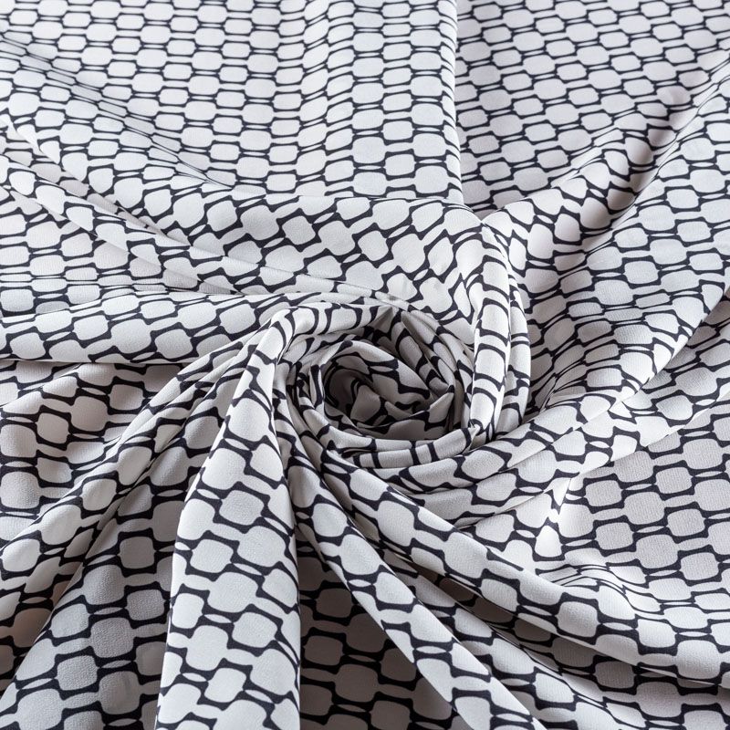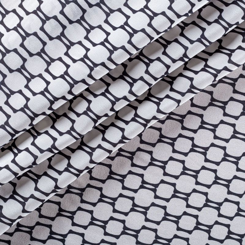 Итальянский натуральный крепдешин с абстрактным черным принтом тонкий, немного прозрачный, отлично драпируется, легкий и струящийся. Идеально подойдет для пошива платьев и сарафанов расклешенных моделей, с воланами, летящих юбок, топов, блузки, юбки, широких брюк, костюма в пижамном стиле.