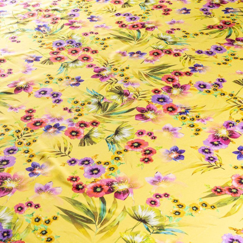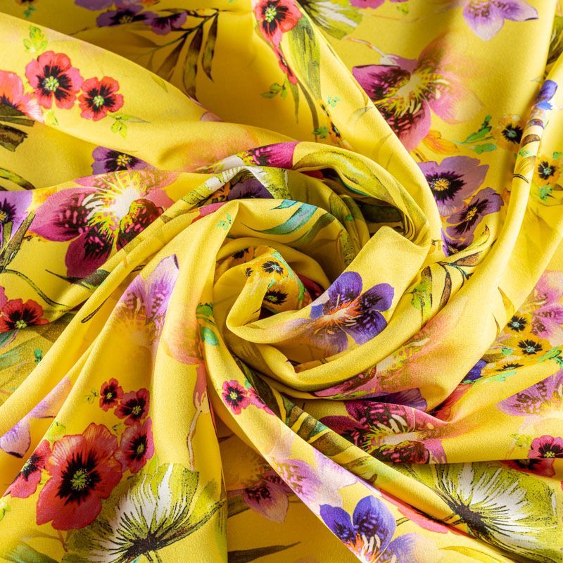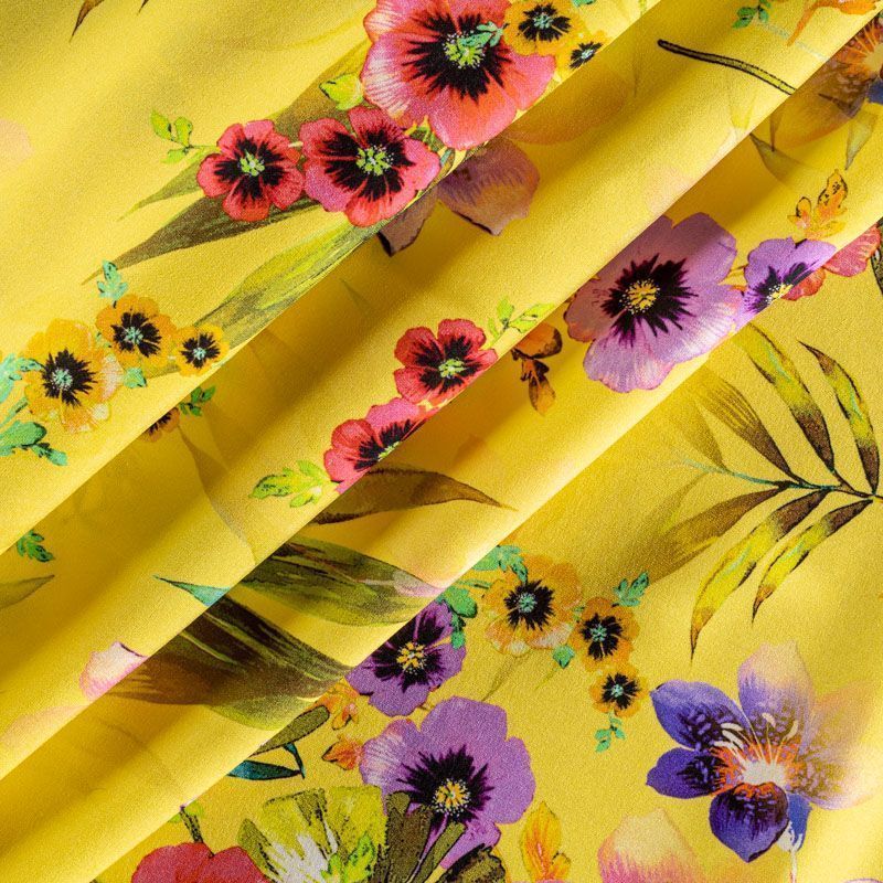 Натуральный шелковый крепдешин с матовой поверхностью, легкий, струящийся, хорошо драпируется, тянется за счет эластана в составе. Цветочный принт выполнен в ярких актуальных оттенках, который будет уместен для пошива летнего сарафана, платья, блузки, костюма в пижамном стиле, широких брюк или юбки.