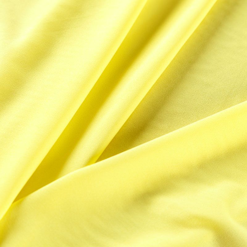 Крепдешин ярко-желтого оттенка с зеленоватым подтоном, тонкий, легкий, фактурный, приятный на ощупь. Очень пластичный, тянется за счет эластана в составе, прекрасно драпируется и струится. Ткань слегка просвечивает, можно использовать подклад. Идеально будет смотреться в платье, юбке, тунике, рубашке или блузке.