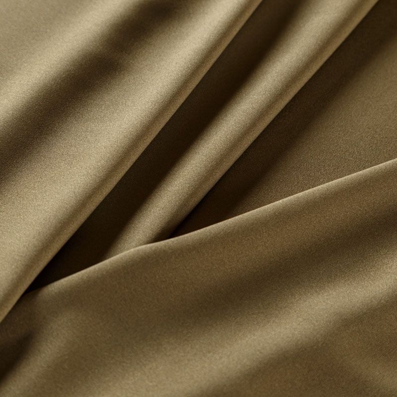 Крепдешин оттенка хаки, тонкий, легкий, фактурный, приятный на ощупь. Очень пластичный, тянется за счет эластана в составе, прекрасно драпируется и струится. Ткань слегка просвечивает, можно использовать подклад. Идеально будет смотреться в платье, юбке, тунике, рубашке или блузке.