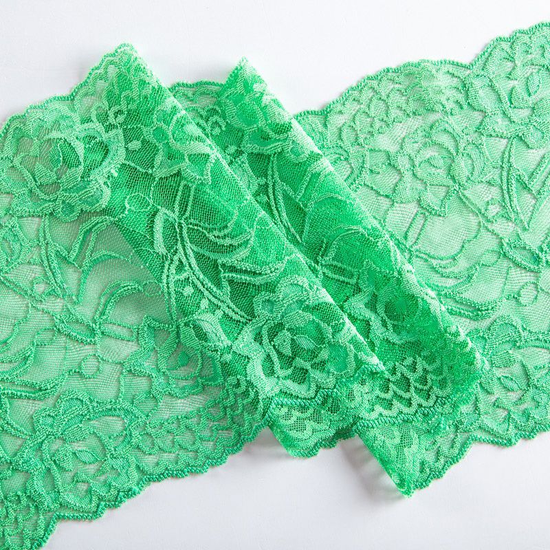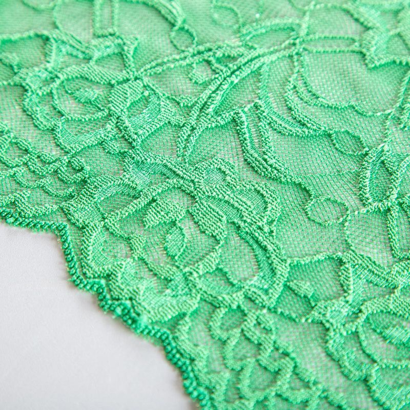 Эластичное кружево сочетает в себе мягкость, прочность и красоту, благодаря своей упругости оно долго не теряет первоначальную форму. Используется для пошива нижнего белья, а так же применяется как отделочный декор в одежде.