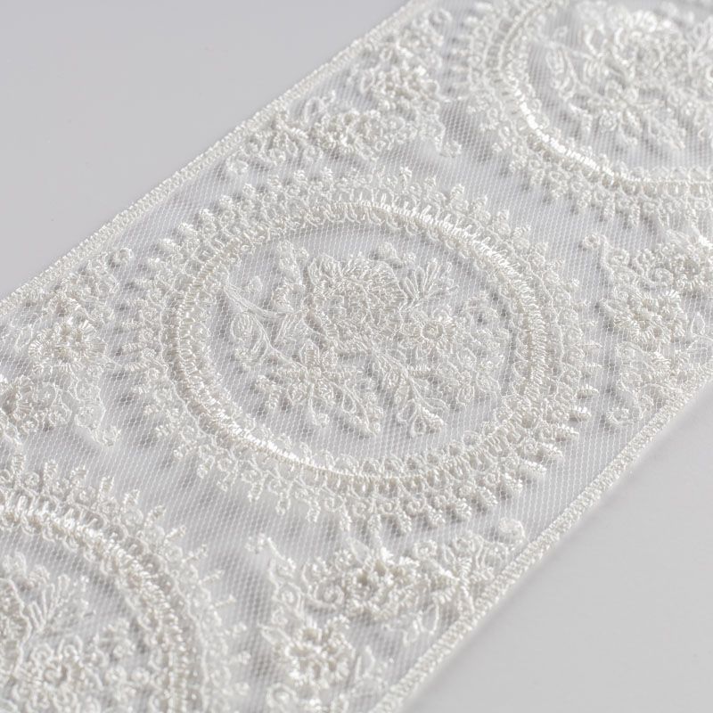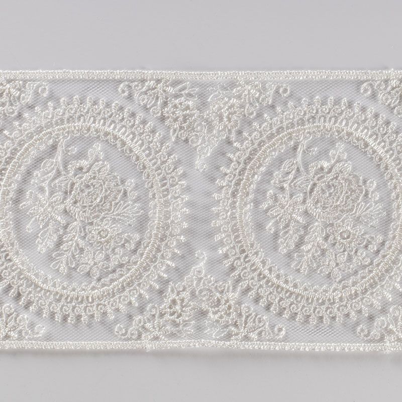 Кружево на сетке представляет собой кружевное полотно, основа которого сетка или фатин. Применяется для декоративной отделки лёгкой женской одежды и домашнего текстиля. Края фигурные, обработаны с двух сторон.