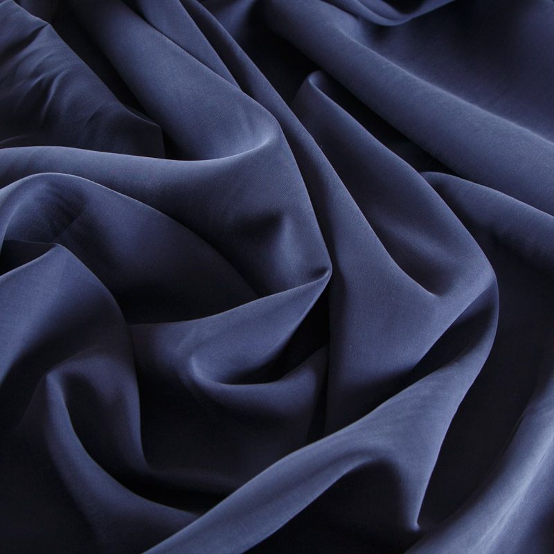 Итальянская купро плательно-костюмной плотности синего оттенка. Ткань мягкая, пластичная, струящаяся, отлично драпируется, не просвечивает. Поверхность ткани бархатистая, похожа на мокрый шелк. Идеально подойдет для платьев свободного силуэта, брюк-палацио, юбок, шорт, туник, платья-рубашки, блузы.