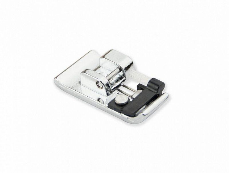 Лапка используется для краеобметочных строчек. Кисточка на лапке позволяет равномерно распределить нить при шитье. Лапка имеет направляющую для ткани, за счет которой край ткани сохраняется плоским. Идеально подходит для средних или тяжелых ткани, такие как твид, габардин и лен, строчка прокладывается ровно, край ткани не стягивается.