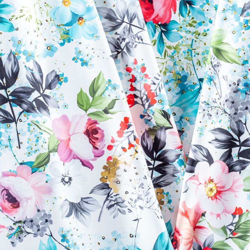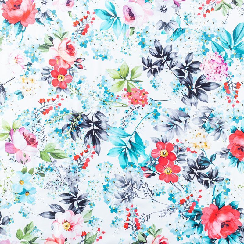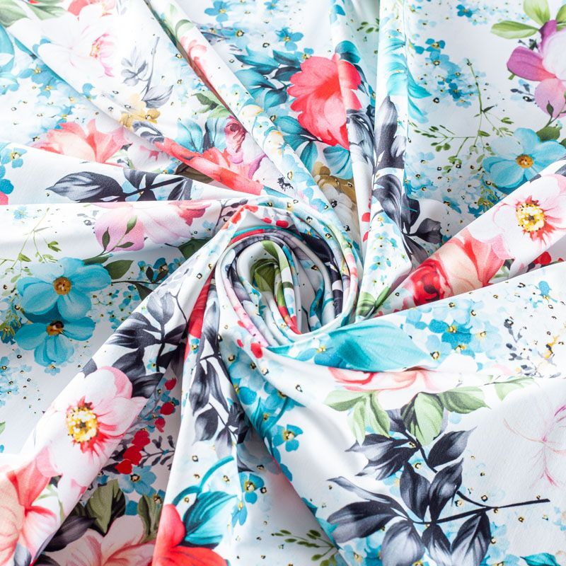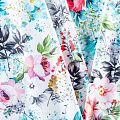 Итальянский бифлекс с ярким акварельным цветочным принтом. Поверхность ткани матовая и гладкая. Отлично тянется, одежда из него не сковывает движения. Хорошо впитывает влагу и быстро высыхает, не вызывет аллергии и раздражения. Используется для пошива эстрадных, спортивных костюмов, купальников, боди.