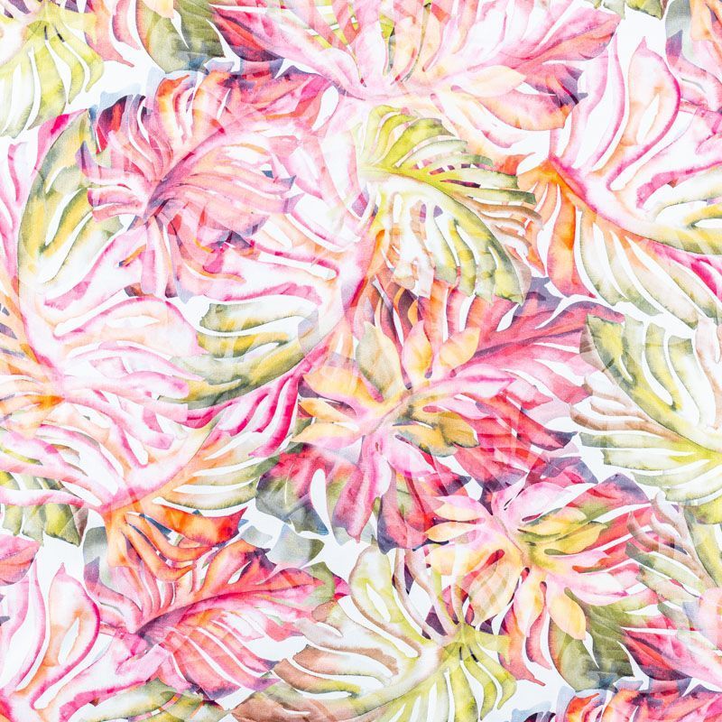 Итальянский бифлекс с крупным тропическим принтом. Поверхность ткани матовая и гладкая. Отлично тянется, одежда из него не сковывает движения. Хорошо впитывает влагу и быстро высыхает, не вызывет аллергии и раздражения. Используется для пошива эстрадных, спортивных костюмов, купальников, боди.