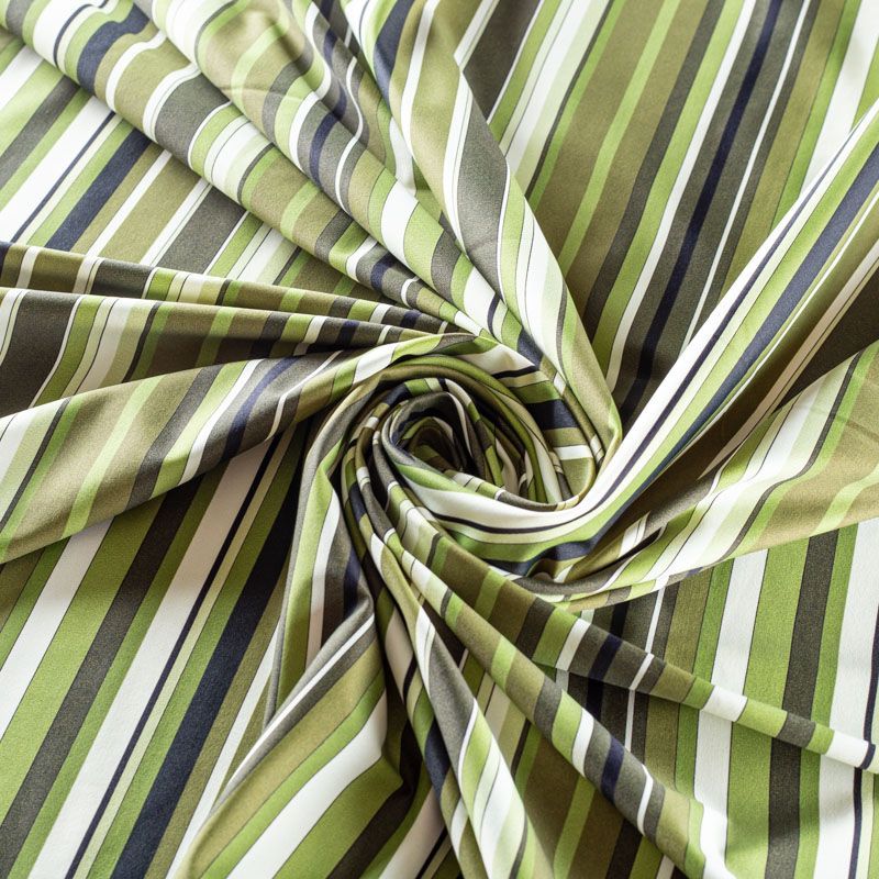 Итальянский бифлекс с разноразмерными полосками в отенках хаки. Поверхность ткани матовая и гладкая. Отлично тянется, одежда из него не сковывает движения. Хорошо впитывает влагу и быстро высыхает, не вызывет аллергии и раздражения. Используется для пошива эстрадных, спортивных костюмов, купальников, боди.
