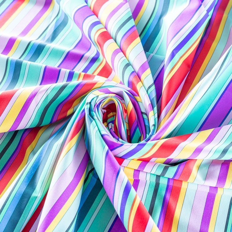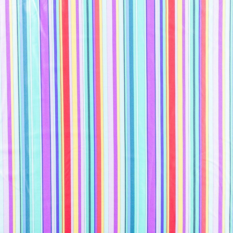 Итальянский бифлекс с разноцветными и разноразмерными полосками. Поверхность ткани матовая и гладкая. Отлично тянется, одежда из него не сковывает движения. Хорошо впитывает влагу и быстро высыхает, не вызывет аллергии и раздражения. Используется для пошива эстрадных, спортивных костюмов, купальников, боди.