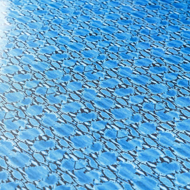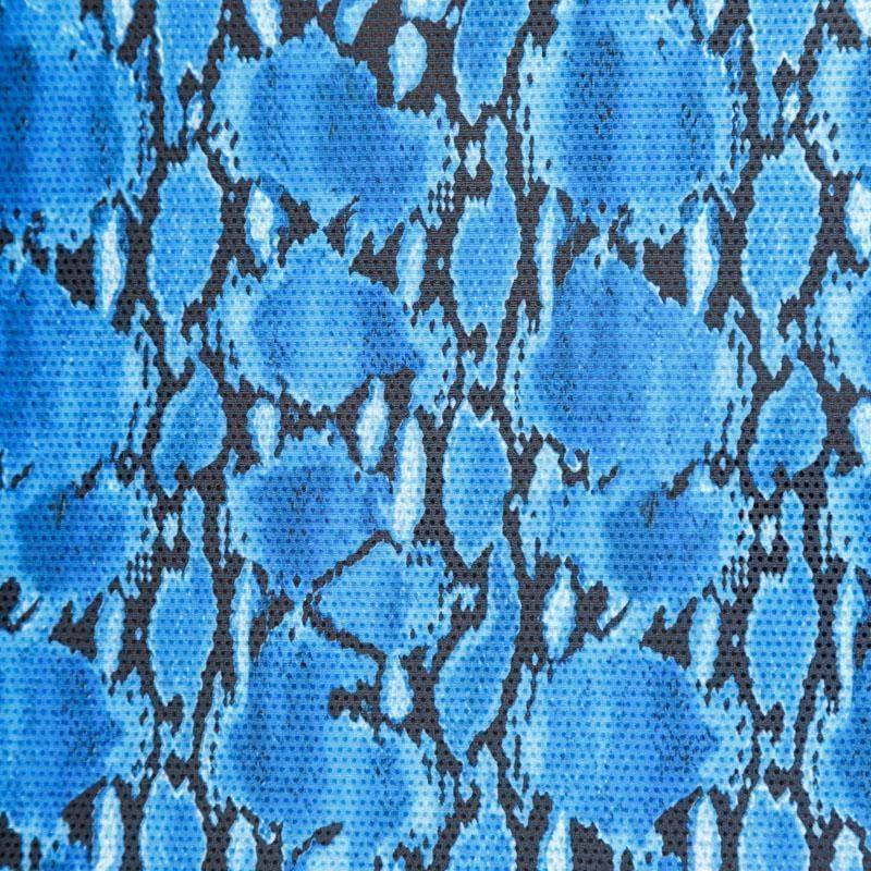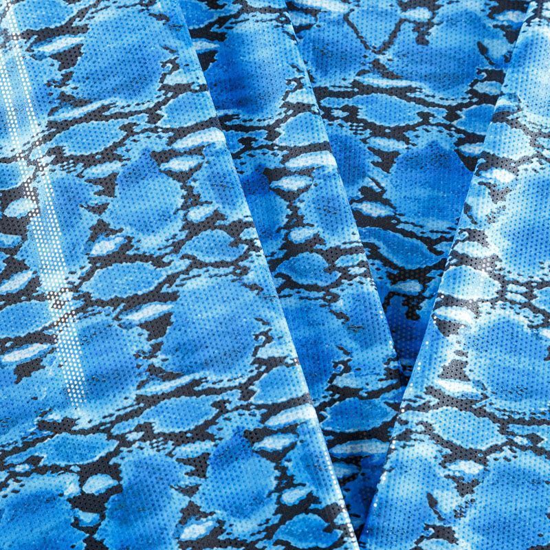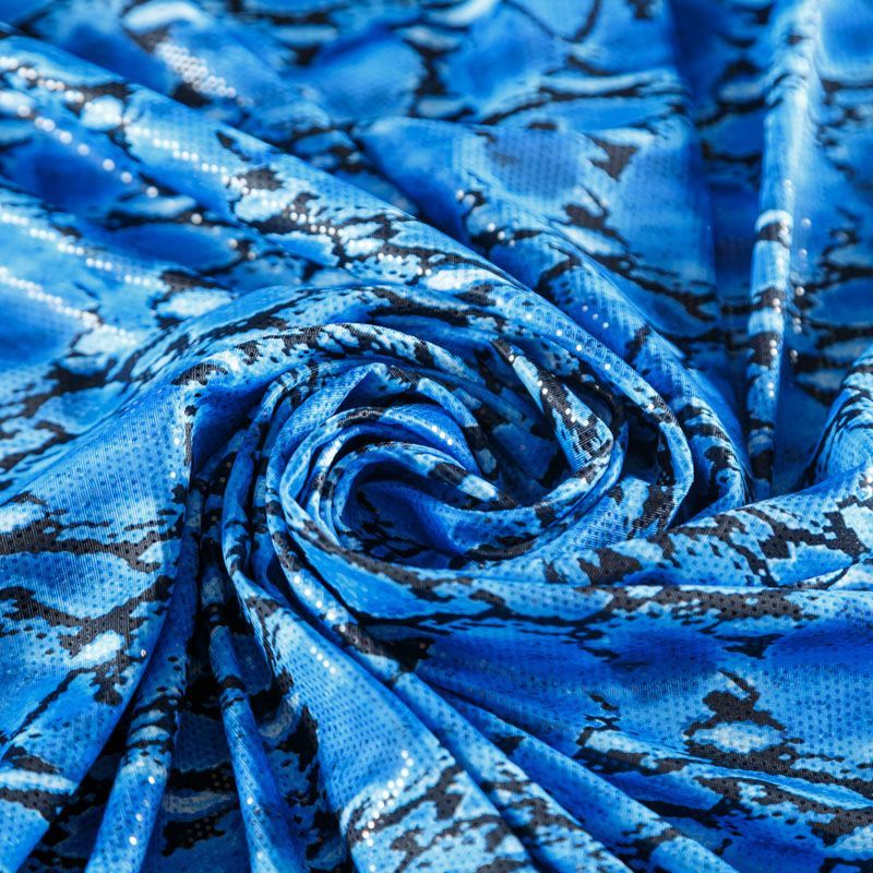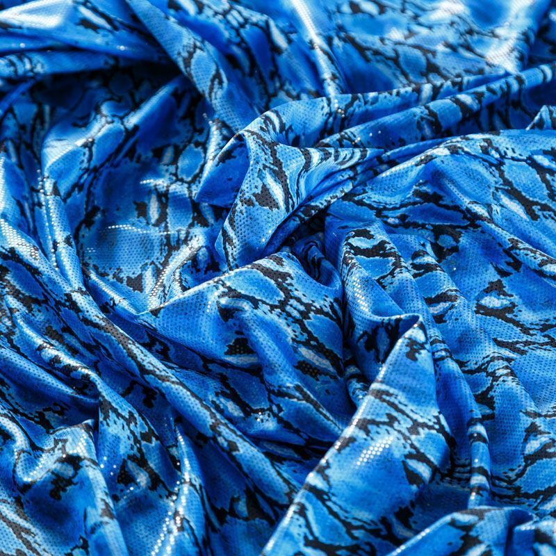 Итальяская качественная, красивая и приятная на ощупь лайкра с анималистическим принтом в ярко-синем оттенке. Поверхность имеет искрящийся глянец за счет лазерной обработки ткани. Идеально облегает фигуру, тянется по двум направлениям, хорошо драпируется, отлично держит форму, устойчива к пилингу, долговечна и гигроскопична. Используется для пошива одежды для танцев, гимнастики, фигурного катания, для велоспорта, легкой атлетики и аэробики, фитнеса и других видов спорта, для купальников, женского белья, театральных, цирковых и эстрадных костюмов.