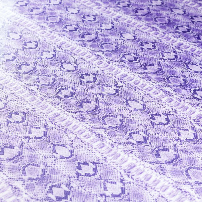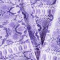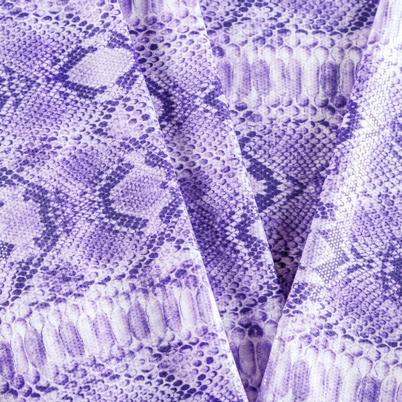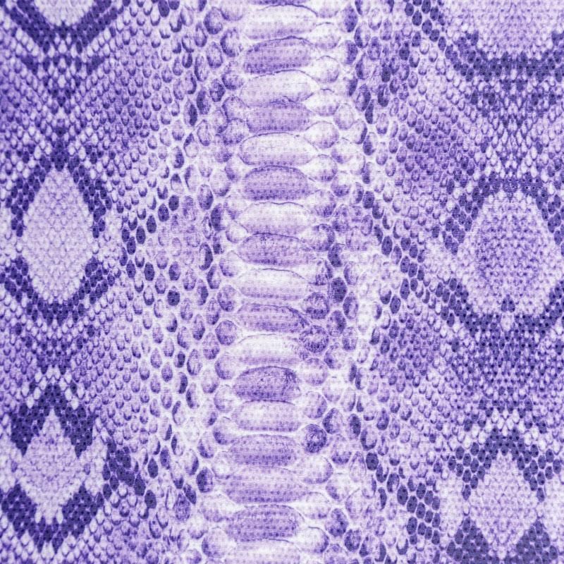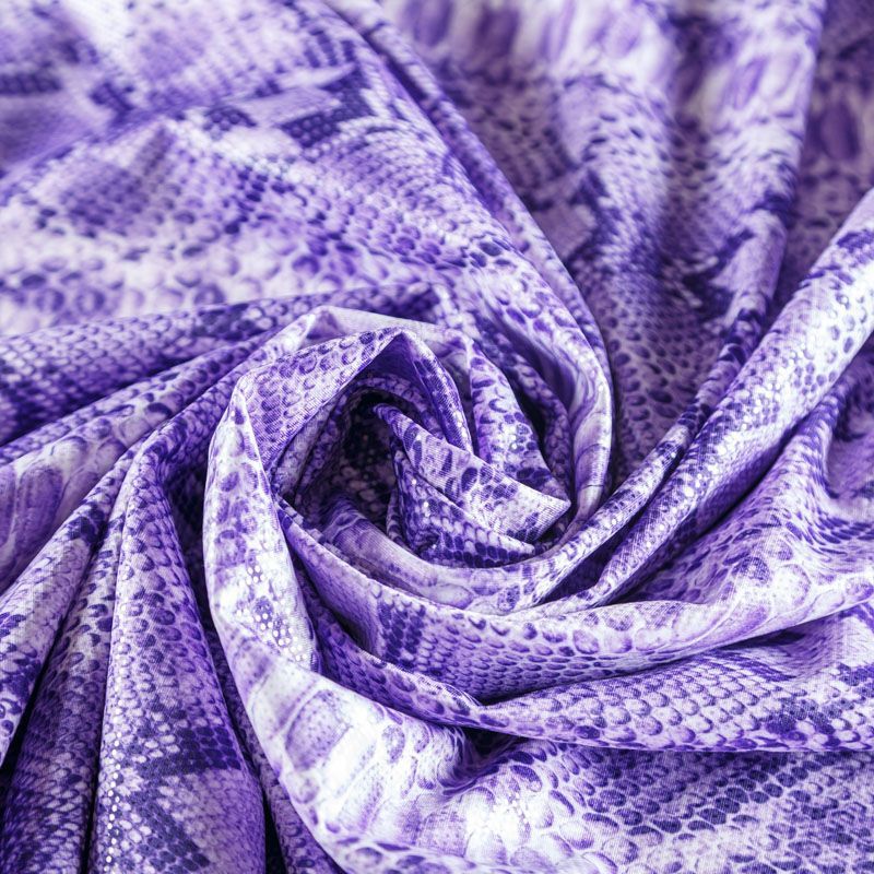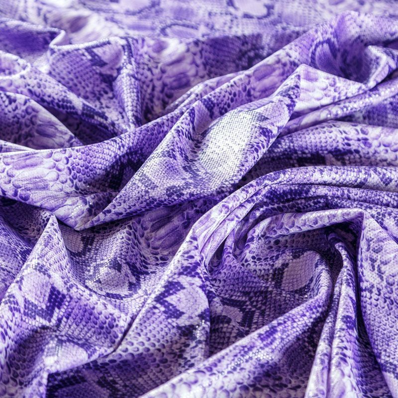 Итальяская качественная, красивая и приятная на ощупь лайкра с анималистическим принтом в фиолетовом оттенке. Поверхность имеет искрящийся глянец за счет лазерной обработки ткани. Идеально облегает фигуру, тянется по двум направлениям, хорошо драпируется, отлично держит форму, устойчива к пилингу, долговечна и гигроскопична. Используется для пошива одежды для танцев, гимнастики, фигурного катания, для велоспорта, легкой атлетики и аэробики, фитнеса и других видов спорта, для купальников, женского белья, театральных, цирковых и эстрадных костюмов.
