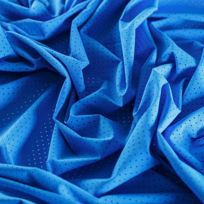 Итальяская качественная, красивая и приятная на ощупь лайкра с перфорацией синего оттенка. Поверхность ткани матовая, гладкая, шелковистая на ощупь. Идеально облегает фигуру, тянется по двум направлениям, хорошо драпируется, отлично держит форму, устойчива к пилингу, долговечна и гигроскопична. Используется для пошива одежды для танцев, гимнастики, фигурного катания, для велоспорта, легкой атлетики и аэробики, фитнеса и других видов спорта, для купальников, женского белья, театральных, цирковых и эстрадных костюмов.