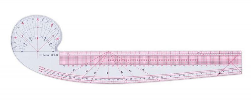 На лекале нанесена разметка: - 6, 12, 15 мм вдоль скругленной стороны, что позволяет проводить плавные линии и измерять скругленные участки; - 4, 6, 8 мм для создания ровных и длинных линий; - углы от 30° до 90° для построения угла нужного размера на выкройке. Метрическая система измерений: см и мм.