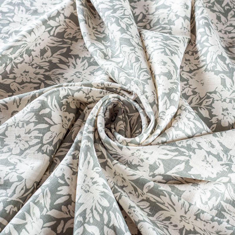 Льняная плательная ткань с добавлением вискозы серого оттенка с цветочным принтом. Материал прочный, с выразительной матовой рельефной поверхностью, полотняным плетением, хорошо держит форму, мягкий на ощупь, пластичный, отлично драпируется. Прекрасно подойдет для пошива летних платьев, сарафанов, юбок, рубашек, брюк и шорт.