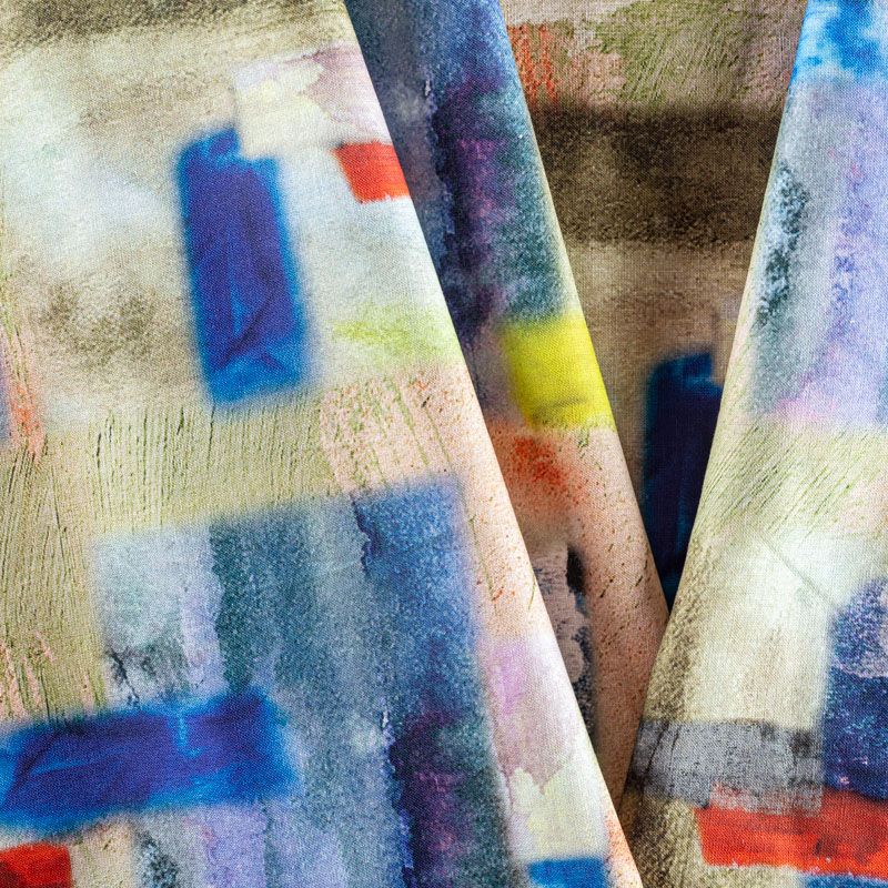 Льняная плательно-рубашечная ткань с добавлением бемерии в бежево-синих оттенках с абстрактным принтом. Материал прочный, с выразительной матовой рельефной поверхностью, полотняным плетением, хорошо держит форму, мягкий на ощупь, пластичный, отлично драпируется. Прекрасно подойдет для пошива летних платьев, сарафанов, юбок, рубашек, брюк и шорт.