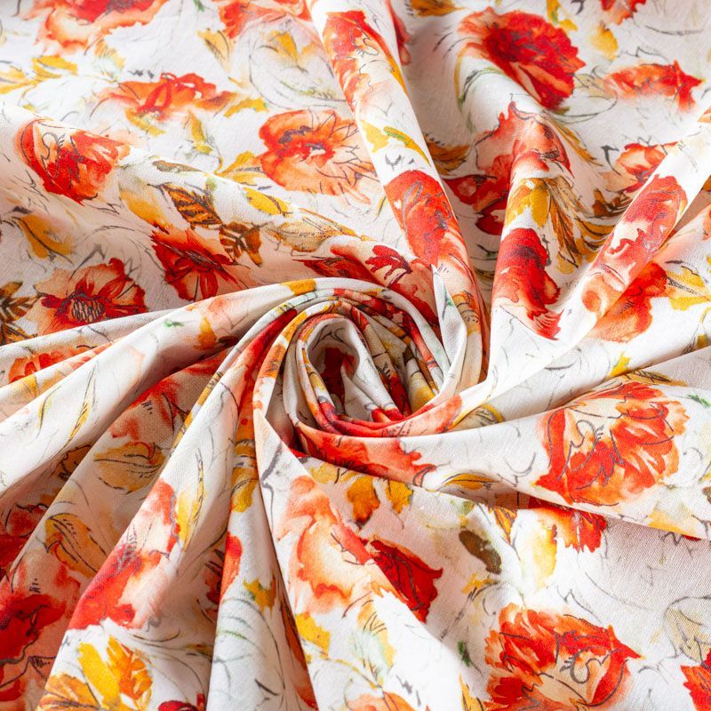 Льняная плательно-рубашечная ткань с добавлением бемерии в белом цвете с акварельными красными маками. Материал прочный, с выразительной матовой рельефной поверхностью, полотняным плетением, хорошо держит форму, мягкий на ощупь, пластичный, отлично драпируется. Прекрасно подойдет для пошива летних платьев, сарафанов, юбок, рубашек, брюк и шорт.