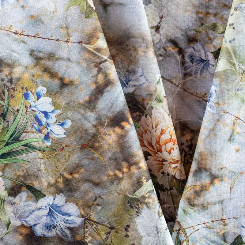 Льняная плательно-рубашечная ткань с добавлением бемерии в серых оттенках с реалистичным цветочным фотопринтом. Материал прочный, с выразительной матовой рельефной поверхностью, полотняным плетением, хорошо держит форму, мягкий на ощупь, пластичный, отлично драпируется. Прекрасно подойдет для пошива летних платьев, сарафанов, юбок, рубашек, брюк и шорт.