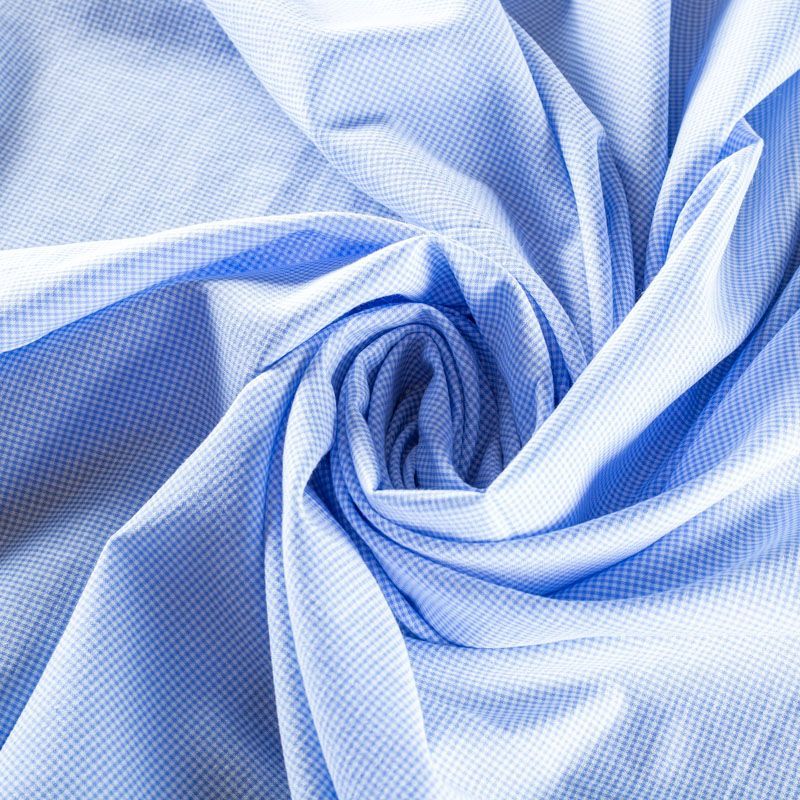 Льняная плательная ткань с добавлением хлопка и полиэстера голубого оттенка в мелкую клеточку. Материал прочный, с выразительной матовой рельефной поверхностью, полотняным плетением, хорошо держит форму, мягкий на ощупь, пластичный, отлично драпируется. Прекрасно подойдет для пошива летних платьев, сарафанов, юбок, рубашек, брюк и шорт.