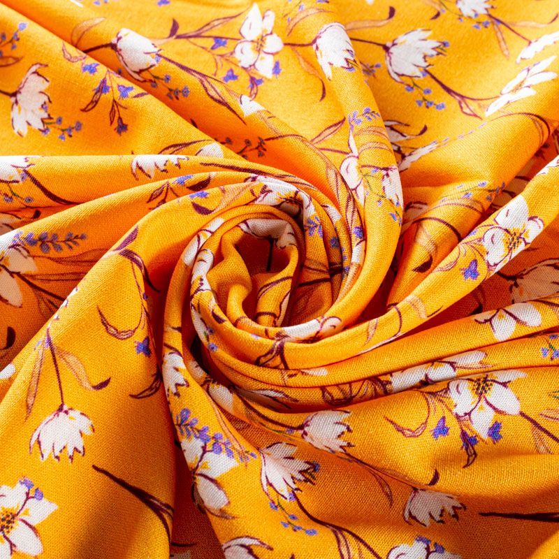Льняная костюмно-плательная ткань желтого оттенка с милым цветочным принтом. Ткань прочная и плотная, с выразительной матовой рельефной поверхностью и полотняным переплетением, отлично держит форму, комфортная в изделии. Стильный вариант для летних пальто, кардиганов, платьев, сарафанов, юбок, жакетов, брюк или шорт.