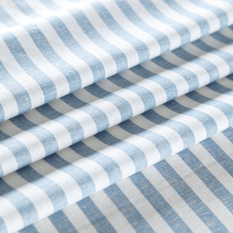 Итальянский плательно-рубашечный лен белого цвета в голубую вертикальную полоску. Ткань прочная, имееет на ощупь приятную, гладкую поверхность, а визуально - выраженный рельеф и полотняное переплетение, пластичная, хорошо драпируется, непрозрачная. Подойдет для пошива широких брюк, рубашек, туники, юбок, платьев, сарафанов, топов, комбинезонов.