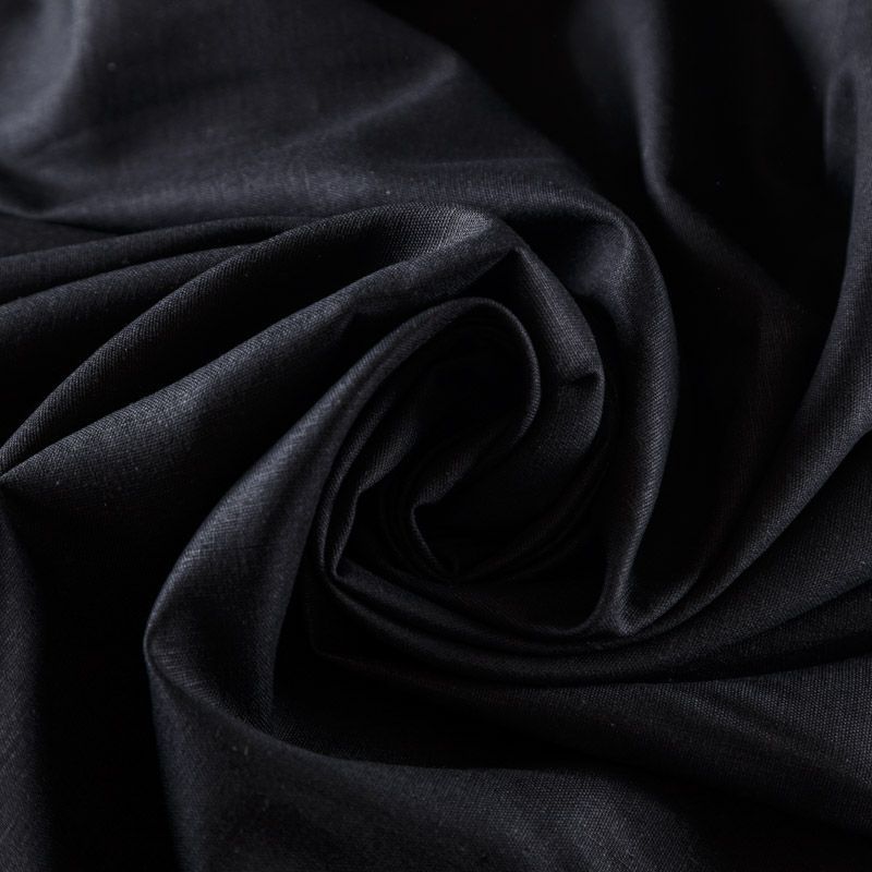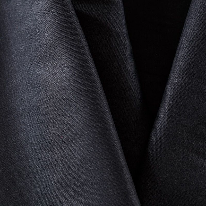 Плательно-рубашечный лен с добавлением вискозы и эластана в черном оттенке. Ткань прочная, имееет на ощупь приятную, гладкую поверхность, а визуально - выраженный рельеф и полотняное переплетение, плачтичная, хорошо драпируется. Подойдет для пошива широких брюк, шорт, рубашек, туники, юбок, платьев, сарафанов, топов, комбинезонов.