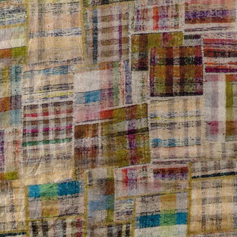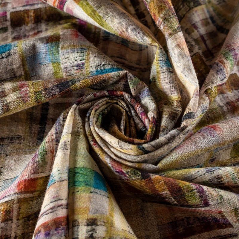 Плательно-рубашечный лен цвета хаки с абстрактным многоцетным принтом. Ткань легкая, средней плотности, поверхность матовая. Приятная на ощупь, хорошо держит форму, немного тянется. Отличный вариант для летних платьев, сарафанов, рубашек, брюк или шорт.