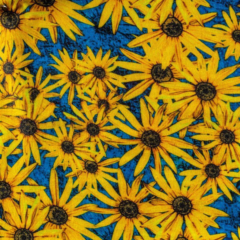 Плательно-рубашечный лен василькового оттенка с ярким солнечным цветочным принтом. Ткань легкая, средней плотности, поверхность матовая. Приятная на ощупь, хорошо держит форму, немного тянется. Отличный вариант для летних платьев, сарафанов, рубашек, брюк или шорт.