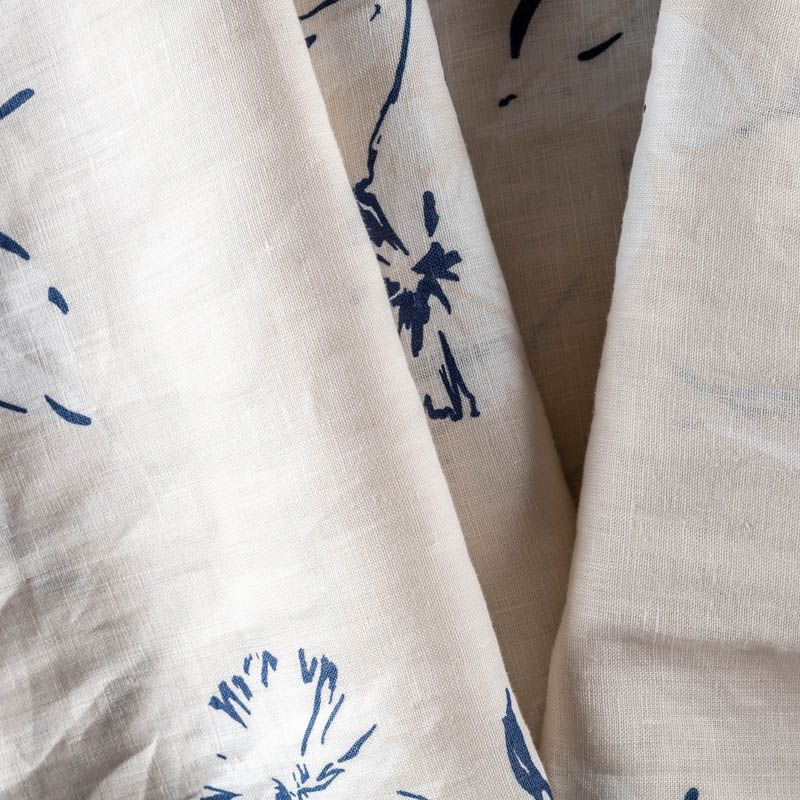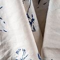 Прочный, выразительная матовая рельефная поверхность, полотняное переплетение, неплохо держит форму, немного просвечивает, хорошо драпируется. Прекрасно подойдет для пошива летних платьев, сарафанов, юбок, брюк и шорт. Бело-синий сдержанный цветочный принт на натуральном фоне экрю.