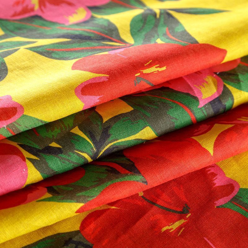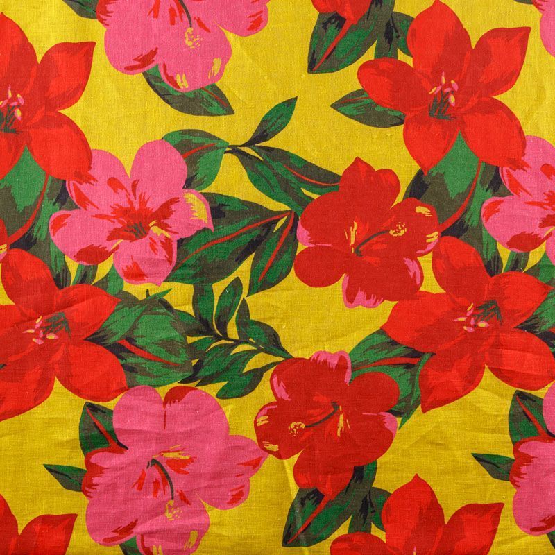 Итальянский плательно-рубашечный лен с добавлением вискозы средней плотности с крупным цветочным принтом в ярких оттенках. Ткань прочная, имеет матовую рельефную поверхность и полотняное переплетение, немного просвечивает, отлично держит форму, пластичная, комфортная в изделии. Отлично подойдет для пошива для летних костюмов, рубашек, туник, платьев, сарафанов, юбок, жакетов, брюк или шорт.