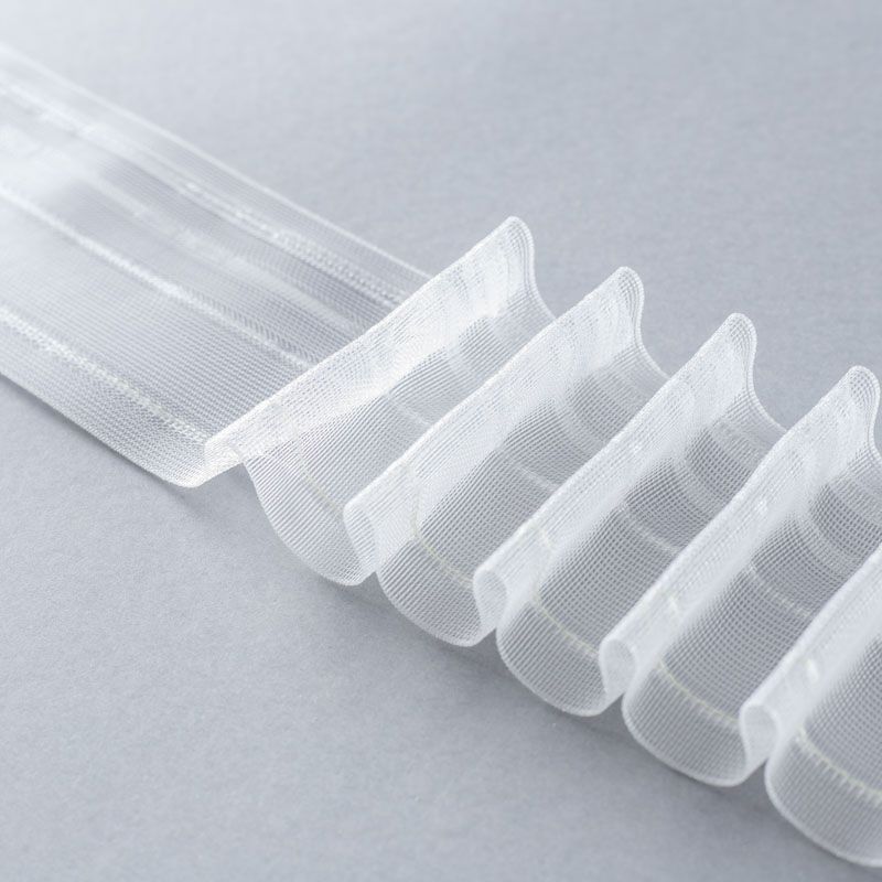 Шторная лента полностью прозрачная для тюлей и портьерных тканей с карандашной сборкой. Сокращение - 1:2,5, раппорт - 6 см, 2 ряда кармашков, крепление - крючки.