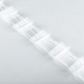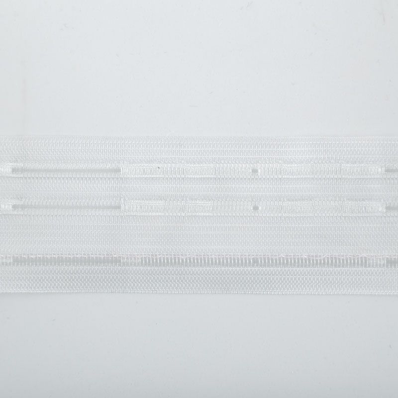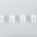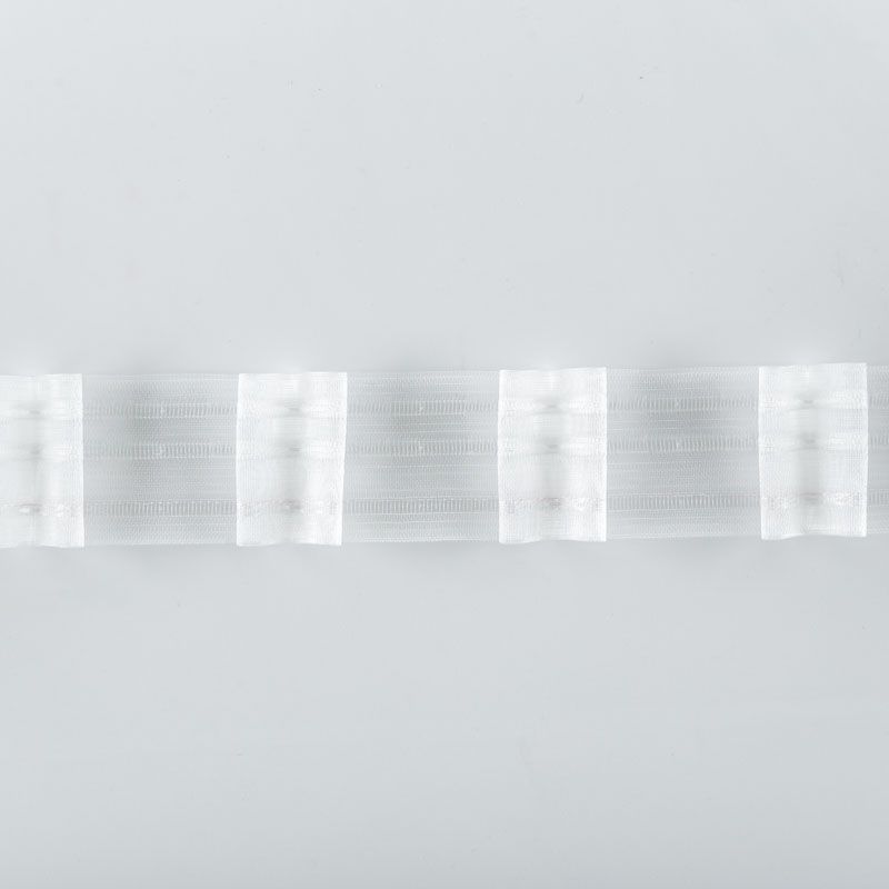 Шторная лента полностью прозрачная для тюлей и портьерных тканей с двойной бантовой складкой. Сокращение - 1:2, раппорт - 16 см, расстояние между складками - 8 см, 2 ряда кармашков, крепление - крючки.